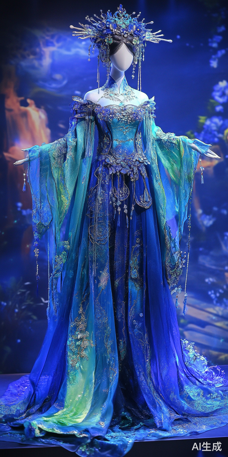 国风精致优雅汉服设计摄影摄像展览:梦幻水晶蓝色妖姬水晶高跟鞋联动流苏仙女汉服,放在假人身上展览,漂亮,颜值高,高大上,上档次,让人有一种摇摇欲仙的欲望,动感的展厅,五颜六色的灯光,在灯光的照映下汉服栩栩如生,惟妙惟肖,完美的细节,8k超高清分辨率,超现代化主义,现实主义场景,未来现实风格,超高清精绘汉服上每一个梦幻般的图案,3D渲染器,场景也是现代化产物,绚烂的灯光让人进入了梦境中。