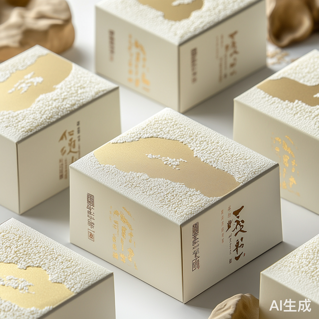 a group of boxes with gold and white written in chinese fonts, in the style of minimal retouching, elegant line work, dreamy pointillism, kimoicore, streamlined design, daguerreian, strong emotional impact Introducing a premium and tactile rice packaging design that beautifully captures the essence of a mountain spring water scene. The package is a testament to elegance and simplicity, featuring an artful depiction of serene flowing water in soft watercolor hues against a backdrop of clean white space. The