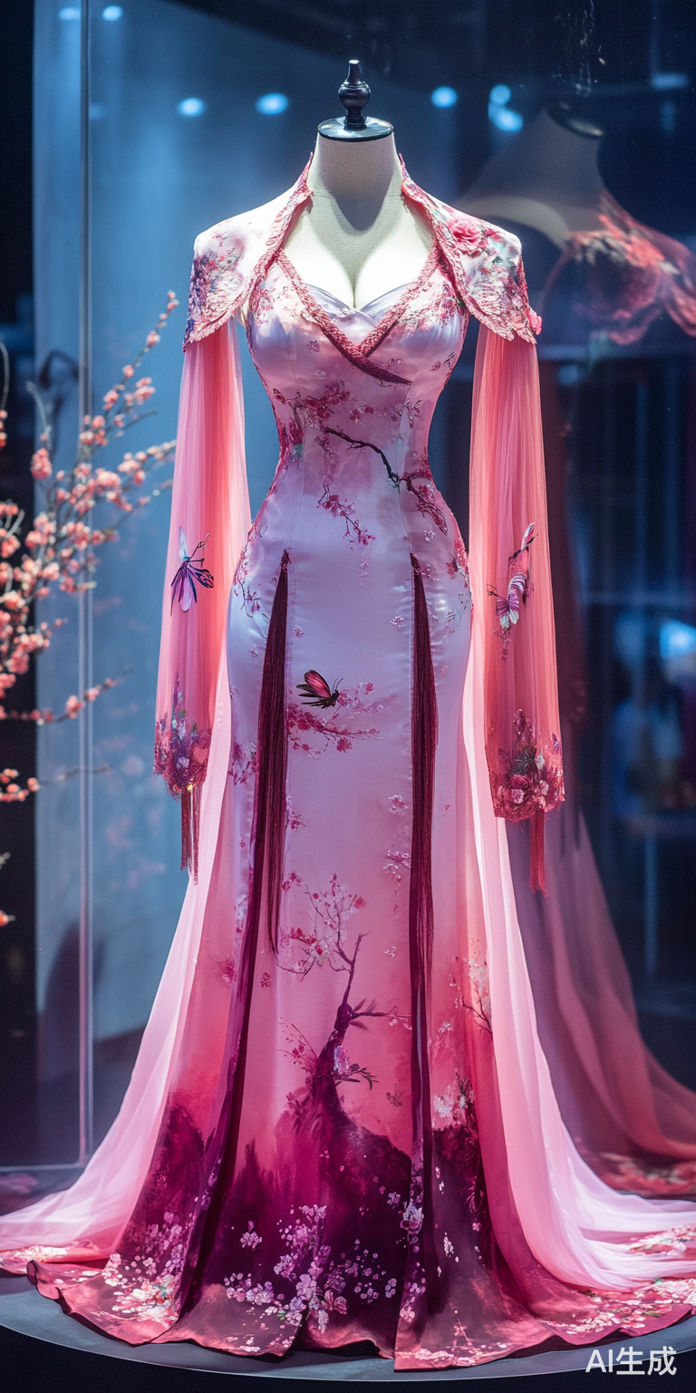 国风旗袍设计展览:梦幻粉色流苏仙女蝴蝶印花旗袍,放在假人身上展览,漂亮,颜值高,高大上,上档次,让人有一种摇摇欲仙的欲望,动感的展厅,五颜六色的灯光,在灯光的照映下旗袍栩栩如生,惟妙惟肖,完美的细节,8k超高清分辨率,超现代化主义,现实主义场景,未来现实风格,高清精绘旗袍上每一个梦幻般的图案,3D渲染器,场景也是现代化产物,绚烂的灯光让人进入了梦境中。