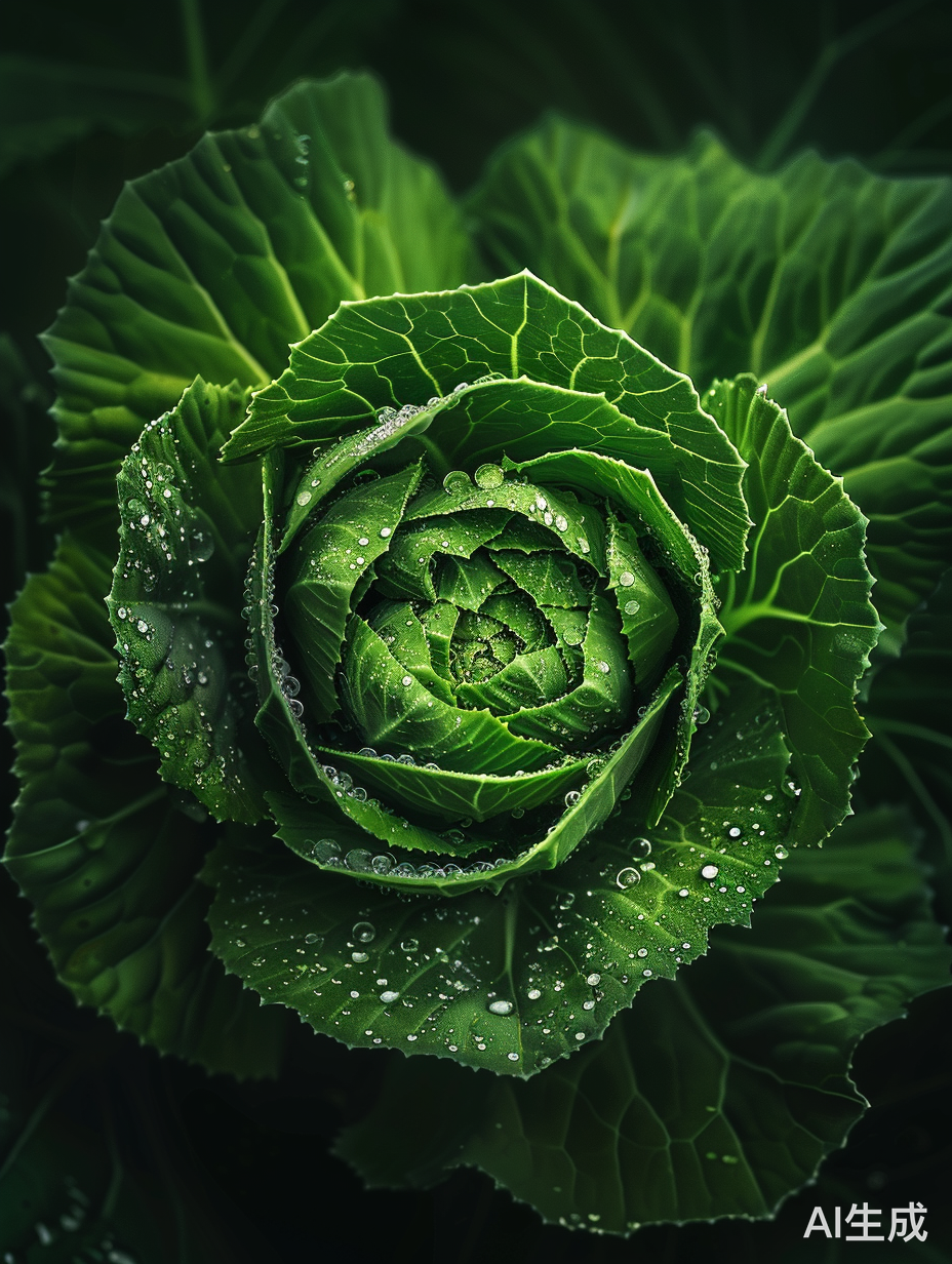 绿色干净背景,一颗像开了花的大白菜,从下往上拍,广角,真实,摄影,露珠,生动,高清,丁达尔效应