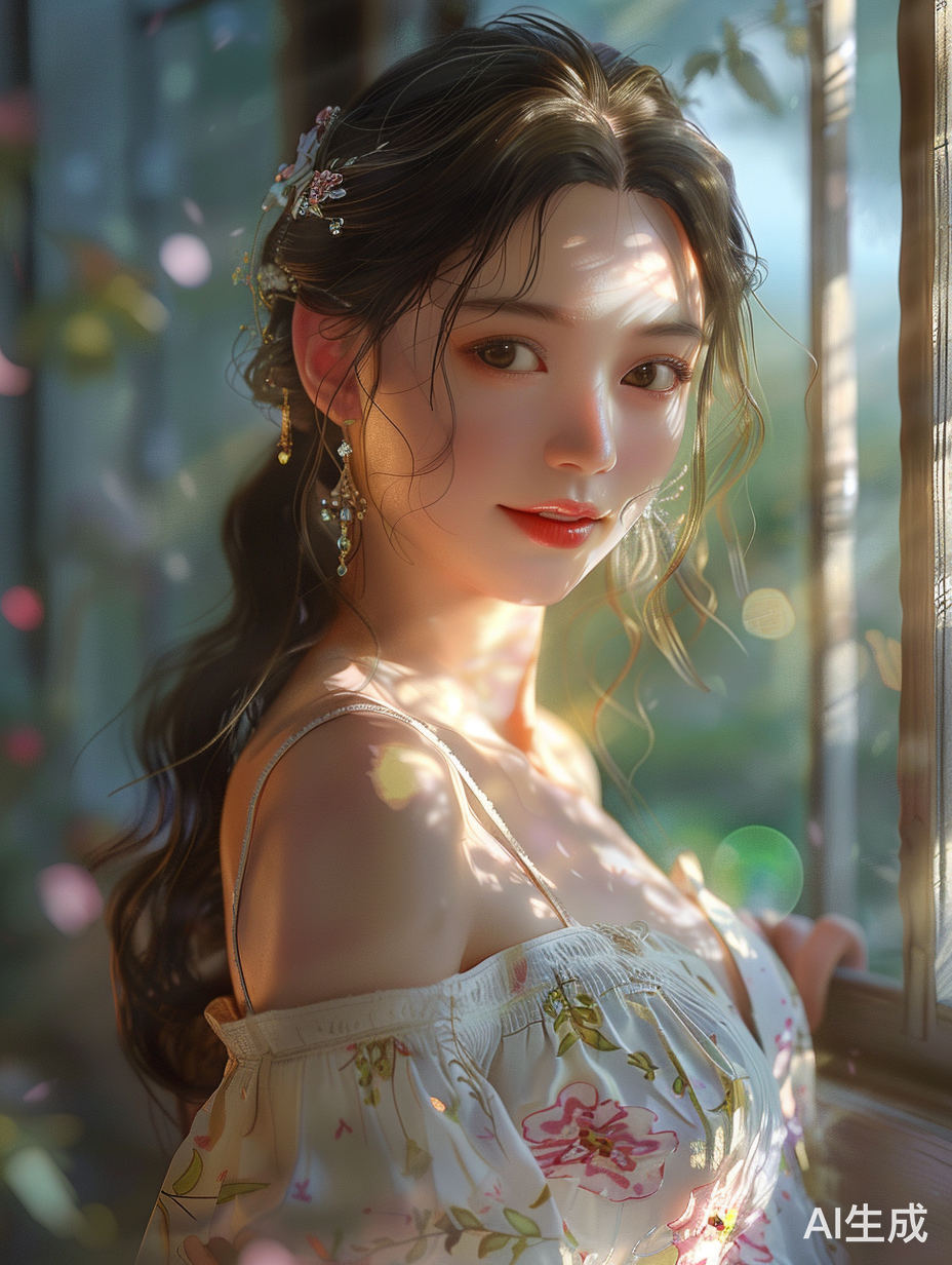 画一张一个中国人时尚模特美丽的女子,漂亮的五官精致,美丽的眼睛,戴流苏小耳环,夏天彩色裙子穿搭,身材肉丰盈性感,在露天的花园手里拿着啤酒杯,
