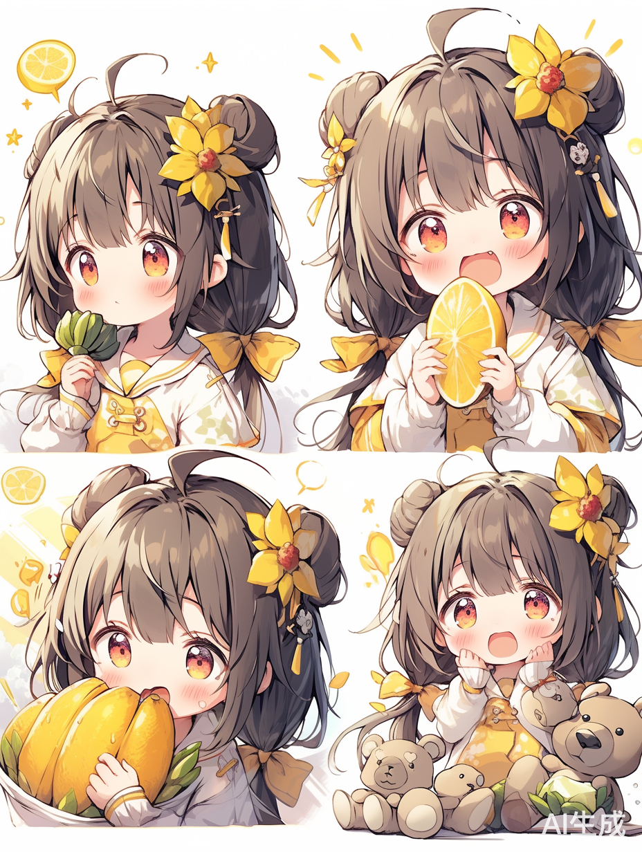 右边一棵柿子树,树柿柿如意,一个小女孩和一个小男孩在摘柿子。人物对比占百分之三