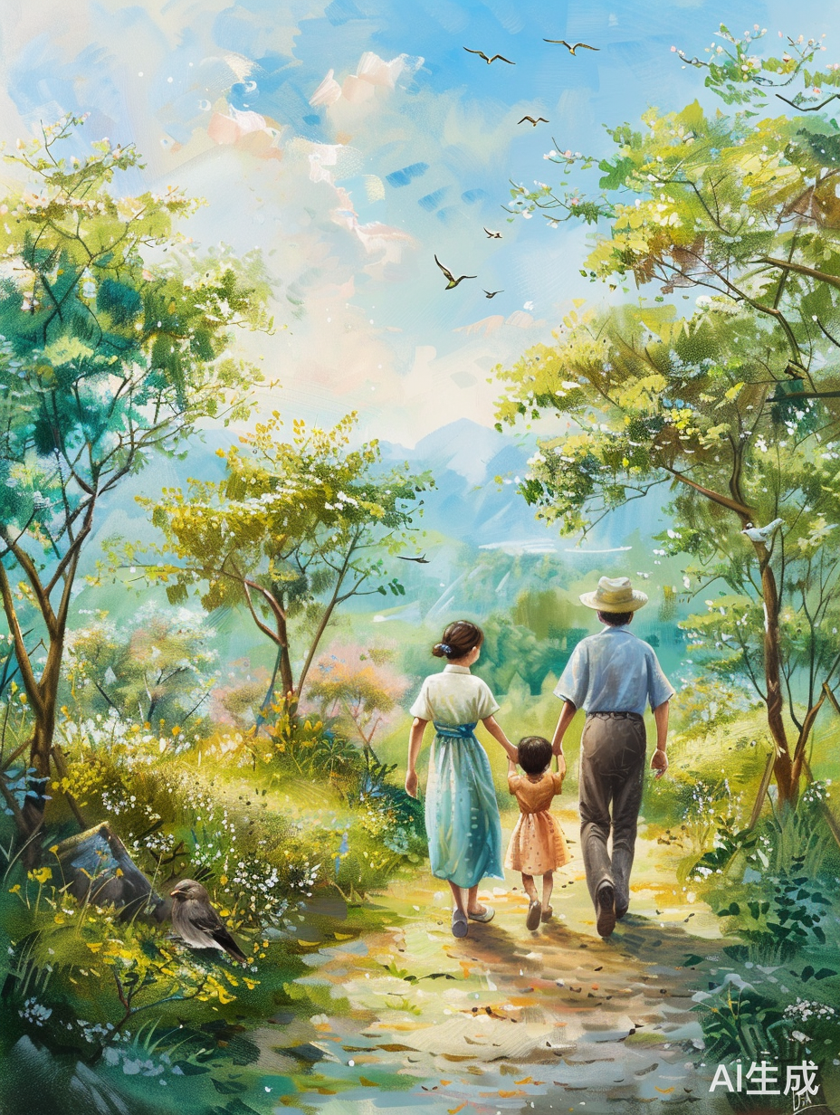 浓郁的绿意,恢宏的山河,涌动的江水,一对欢快的小鸟在天空中嬉戏。绚烂的花朵盛开在道路两旁,给整个画面带来了绚丽的色彩。青翠的树林为这片美景增添了几分神秘感。远处山脉的巅峰被云雾缭绕,仿佛蕴藏着无尽的秘密。阳光穿透云层,洒在一座古老的寺庙上,显得庄严神圣。