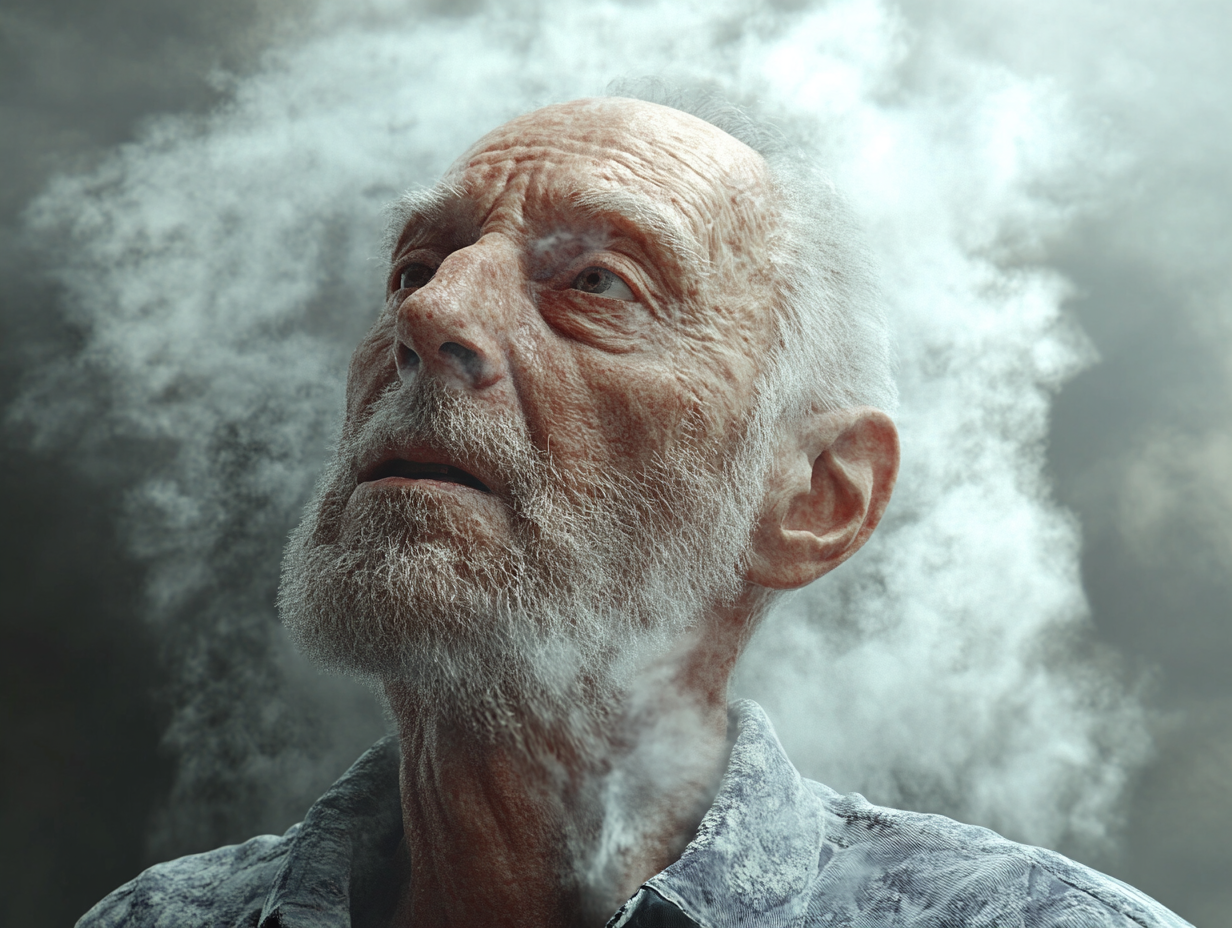 请你画一张及其平凡无奇的iPhone自拍照,没有明确的主体或者构图感——就像是随手一拍的快照。照片略带运动模糊,阳光不均导致轻微曝光过度。角度尴尬,构图混乱,整体呈现出一种刻意的平庸感——就像是从口袋里拿手机时不小心拍到的一张自拍。主角是一个幽灵在户外抽烟。
