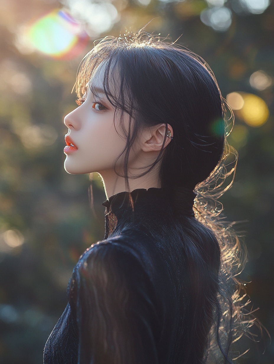 女子展现出清新甜美的学生风穿搭。她留着乌黑的长发,一侧别着精致的花朵发夹,妆容淡雅。上身穿着白色短袖衬衫,领口敞开,搭配一条黑灰条纹的领带,下身是黑色百褶短裙,整体造型简约又青春洋溢。背景是白色墙面,阳光透过树叶留下斑驳光影,衬托出她清纯可人的气质,这种穿搭在校园和日常休闲场景中都很常见,尽显少女的活力与朝气。