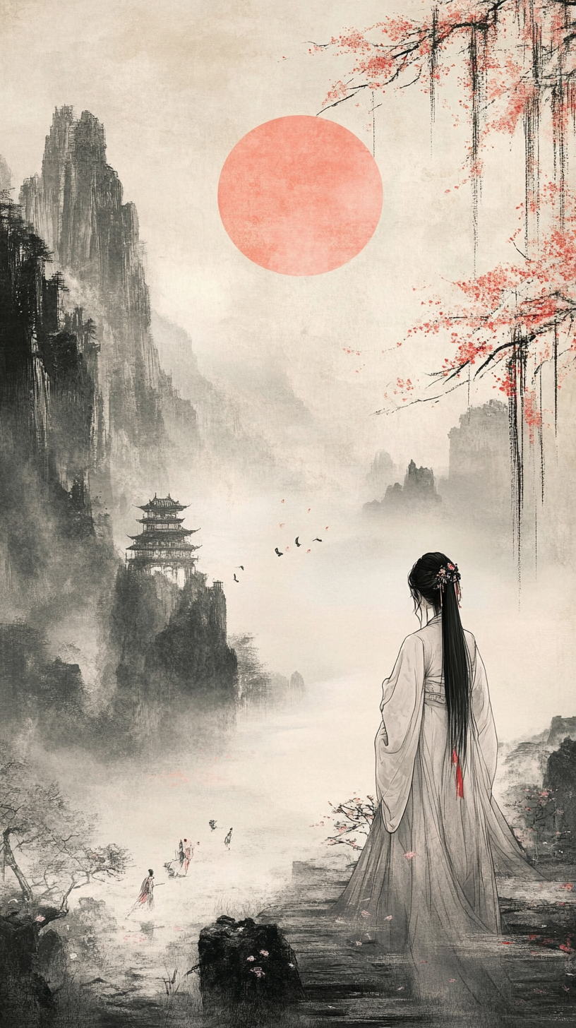 场景构图:司马迁以跪坐姿态居于画面中央,身后夯土墙面肌理斑驳,表面可见竹篾编织纹路与风化裂痕。左侧斜置梯形竹简架,分三层堆叠近百卷简册,部分简牒边缘磨损露出竹纤维。右后方立式木格窗棂间透出深青色夜空,一截虬曲枯枝横斜,弦月冷光在简册表面投下龟甲状格栅阴影。人物细节:司马迁面部呈深麦色,眉弓骨突出形成深邃眼窝,眼角鱼尾纹如刀刻般延伸至鬓角。鼻梁挺直但鼻翼两侧法令纹明显,下颌线条因缺齿稍显松弛。唇色苍白无血色,下巴光洁无任何须根残留。灰白头发以麻布巾扎成椎髻,发际线后移露出宽阔前额,耳际散落数缕银丝。服饰考据:身着右衽曲裾深衣,衣料为粗织苎麻本色,领缘及袖口镶靛青细边(宽度0.8厘米符合马王堆出土实物)。腰间束两指宽葛布带,左侧悬青玉髓印章(参考满城汉墓组佩形制)。曲裾下摆自然铺展于苇席,露出磨损严重的翘头布履,鞋底可见多次修补的葛麻补丁。器物陈设:1. 髹漆松木案几(长120cm×宽60cm×高30cm)表面细密龟裂纹中沁入墨渍,右端置错金云气纹博山炉,炉体高15cm,山形盖镂空处逸出青烟呈螺旋上升。2. 左案角青铜雁鱼灯展开双翼,灯盘盛半凝羊脂,灯烟经雁颈导入腹部清水。灯影在简面投射出水波纹,与墨字形成动态叠