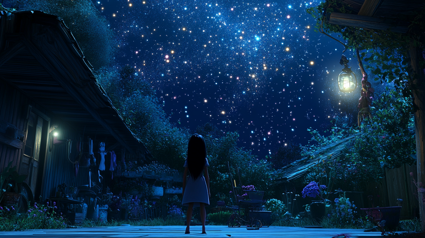在一个美丽的小村庄里,住着一个名叫小米的小女孩。小米的后院种着一株娇艳的月季花,每年春天,它都会开出色彩斑斓的花朵,散发出浓郁的香气,吸引了许多小蜜蜂和蝴蝶。小米每天都会在花丛中嬉戏,和花朵们分享她的小秘密。图宫崎骏风格,花园里一朵美丽的百合花和一个天真无邪的小女孩开心的互动,翠绿的草地,湛蓝的天空,飘浮的白云,五颜六色的野花。童趣的、开心的。超现实主义。梦幻色彩渲染、夸张的比例表现、柔和的光线效果、背景虚化突出主体互动。超高清,超细节,镜头聚焦在一朵有魔力的月季花和小女孩身上