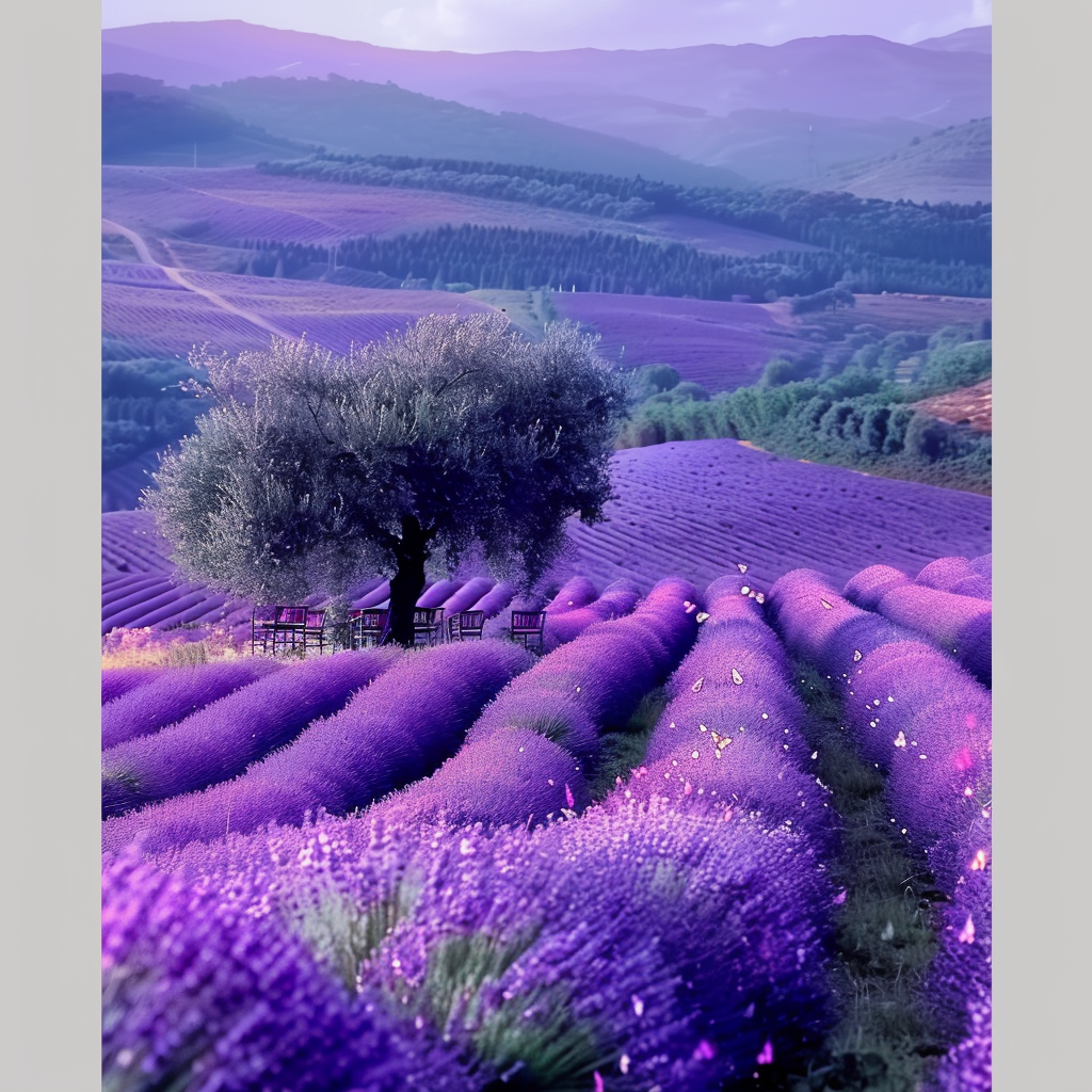 一条宽阔的双向车行道呈缓坡向下延伸,仿佛是大地铺展的丝带。道路两旁是修剪整齐、绿意盎然的草坪,如同柔软的绿毯。草坪上矗立着两排参天大树,它们冠幅超大,粗壮的枝干向四周伸展。枝头密密麻麻地开满了蓝色花朵,花瓣如蝶翼般轻盈。两排大树的树冠相互交织,形成了一条梦幻般的拱形蓝花大道。阳光透过蓝花的缝隙洒下,在路面上形成一片片斑斓的光影。双向两车道的路面上,星星点点地散落着蓝色花瓣,仿佛是大自然洒落的浪漫诗篇。整个画面干净明亮,大气唯美,宛如大师笔下的绝美画卷,尽显高清、高品质之美。