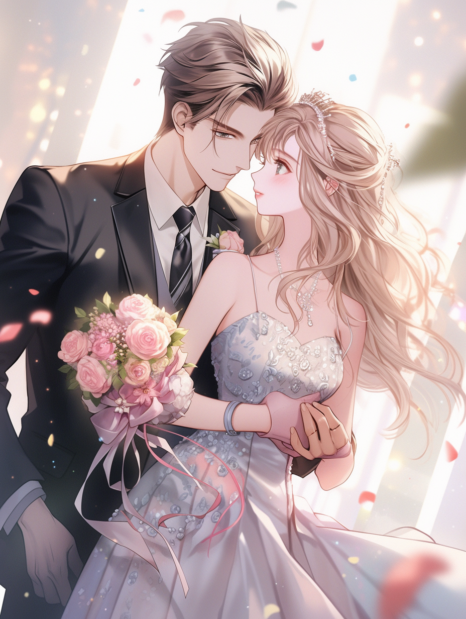 路边两边垂柳盛开,粉色紫色鲜花盛开,路的尽头是一个酒家,酒家的名字是LUCk浓酒馆,酒家院子里鲜花盛开,有向日葵、绣球花。一个身材健朗、英俊,穿着白衬衣的男子拉着一个身材高挑,大波浪长发头戴蝴蝶结,穿着白色连衣裙的女子走向酒家。漫画风格