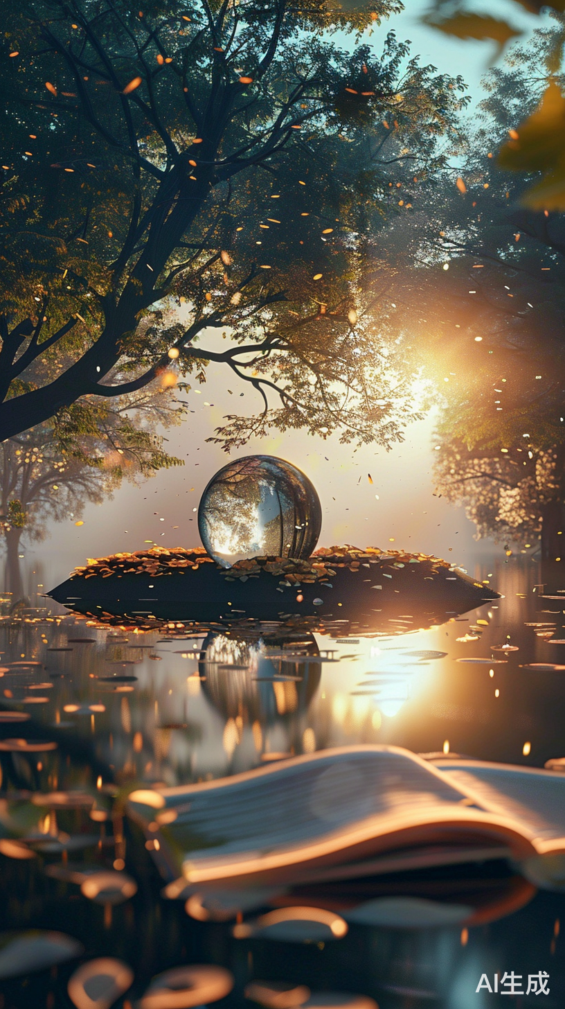 一个超现实世界的3D场景设计,以中心放置的镜子立方体为特点,其中包含一台显示自然景色的苹果MacBook Pro电脑。场景中还包括一棵樱花树,树叶飞舞,并具有反射效果。天空是浅蓝色,使用Octane Render以鲜艳的亮色、高分辨率和高超写实细节渲染而成。非常详细的体积光和体积光线被用于捕捉幻想艺术风格,以高度真实且电影化的手法利用超广角深度场进行表现。