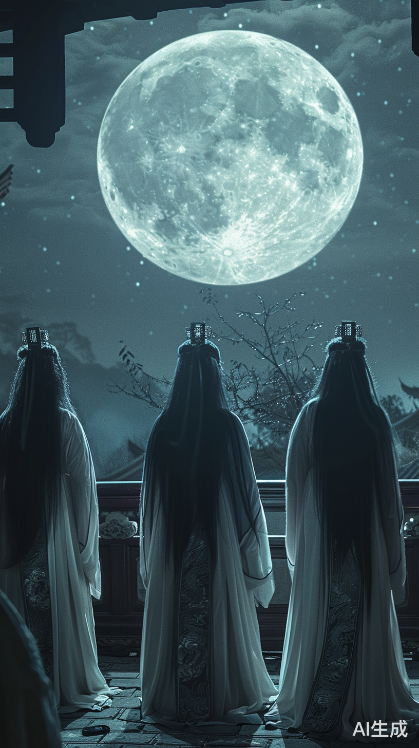 中国古代房间里,黑长发,白色长袍年轻男性,仰望明月,