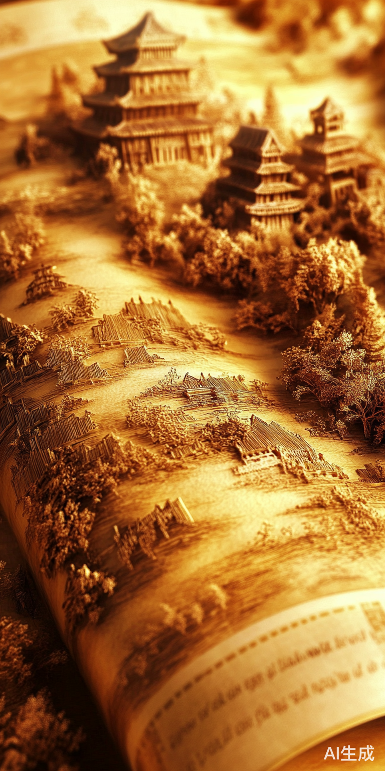 三维古风,巨大的空心透明卷轴,散发着金色的光芒,书卷里包裹着立体的山水建筑,立体微缩景观,闪烁着淡金色的光,每页的一端都有空白处,写满了楷书,金色背景,近景,侧面,聚焦卷轴裹着的立体微缩景观,极致细节,古老的卷轴,3D效果,专业的摄影技术和高清相机创作,微缩景观,微型雕塑,精致的剪纸工艺效果,细致的笔画艺术风格