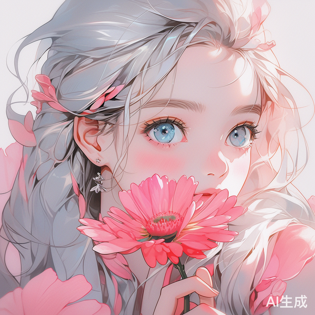 动漫美丽的白色长发女士拿着一朵白色的花,在清晰的新流行插图的风格,现实而富有想象力,超现实的精度,超高清,半身镜头