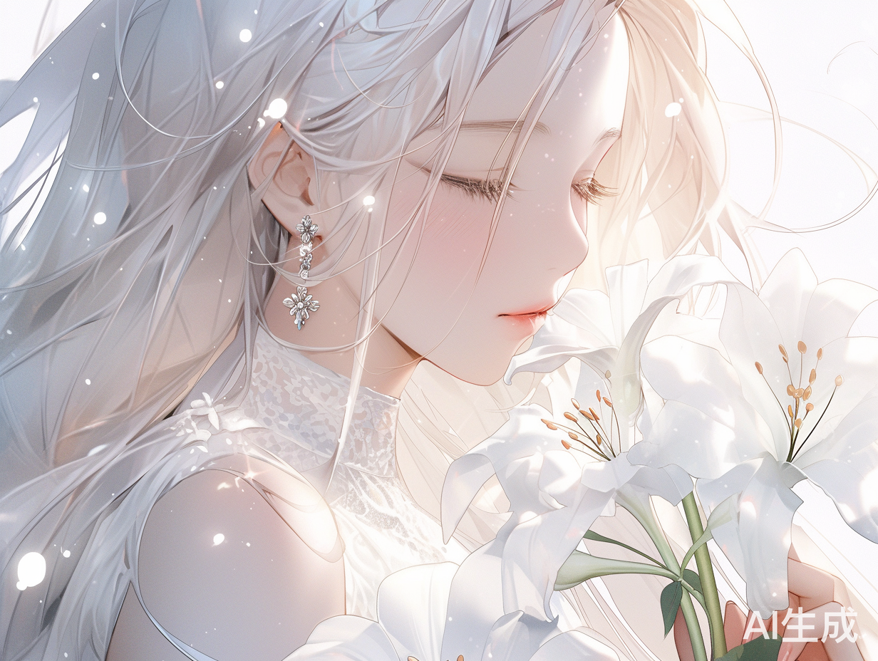 动漫美丽的白色长发女士拿着一朵白色的花,在清晰的新流行插图的风格,现实而富有想象力,超现实的精度