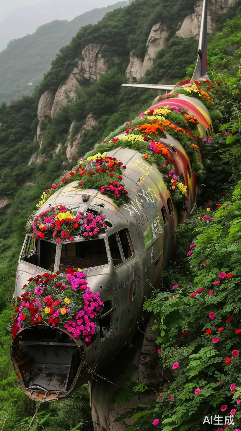 在中国的山区,有两架废弃的飞机,飞机顶部覆盖着五颜六色的玫瑰和鲜花。飞机机身上布满了鲜艳的红色,彩虹、粉色、黄色和紫白色玫瑰。在他们下面的山崖上玫瑰花盛开,你可以看到许多其他盛开的野生玫瑰灌木丛。这一场景在深绿色叶子和花瓣之间形成了惊人的对比
