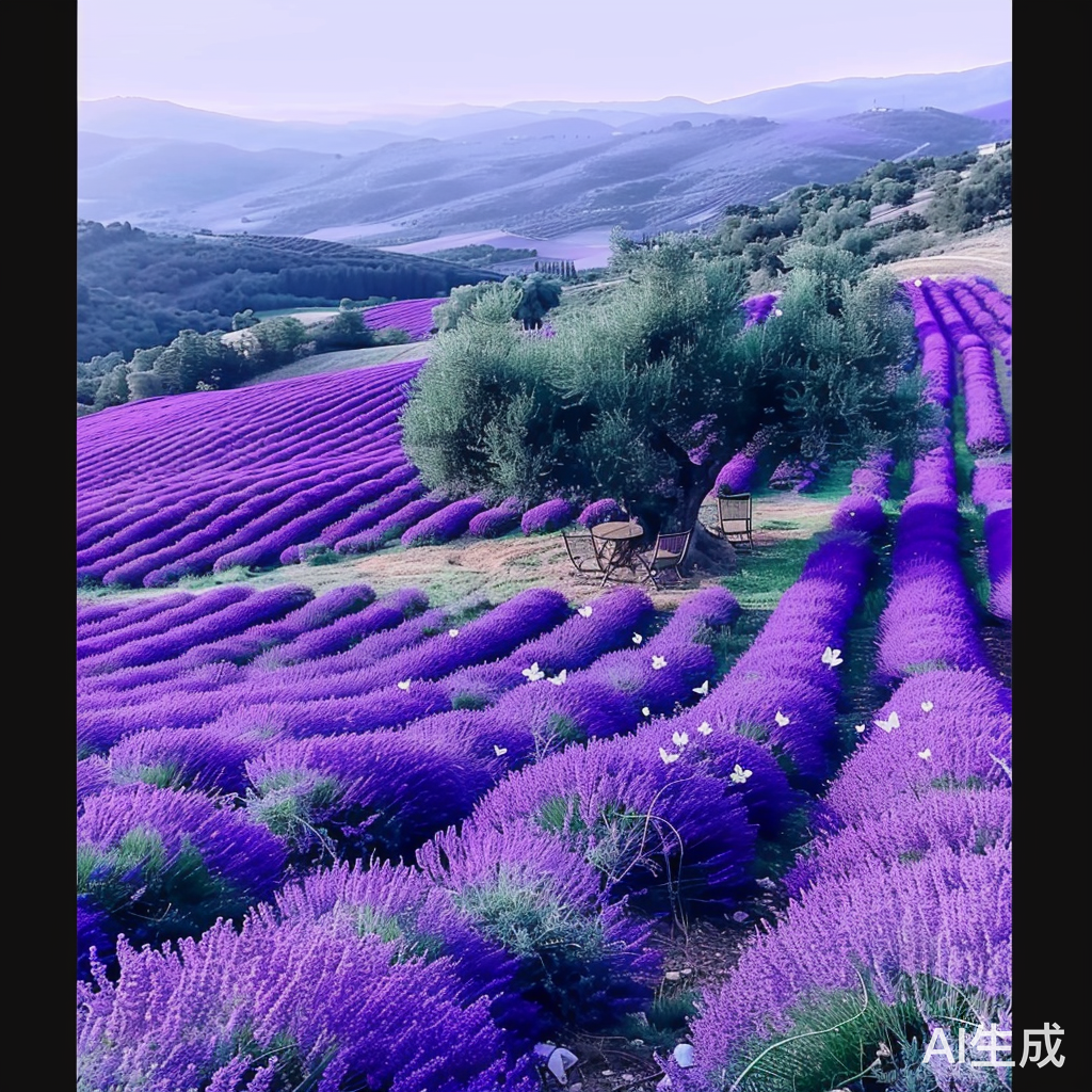 紫色的薰衣草花海,远远望去如同一片紫色波浪荡漾的海洋,花海中翩翩起舞着无数翅膀轻盈的蝴蝶,花海的边缘有一棵古老的橄榄树,树下摆放着几把靠椅,让人可以坐下来欣赏这如画般美丽的花海景色。微风吹过时,薰衣草花海轻轻摇曳,散发出淡淡的香气,仿佛置身于梦幻中的仙境。