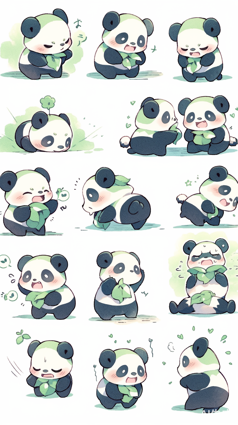 可爱的熊猫形象,拟人化,各种姿势和表情。害羞地、哭大哭、微笑、吃饭、惊讶、大笑、疑问、委屈、搞笑,花痴等表情