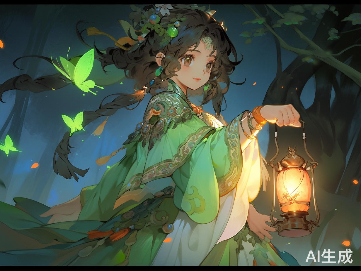 一个古代少女,身穿绿色亮纱裙,手拿照明灯,仙气飘飘