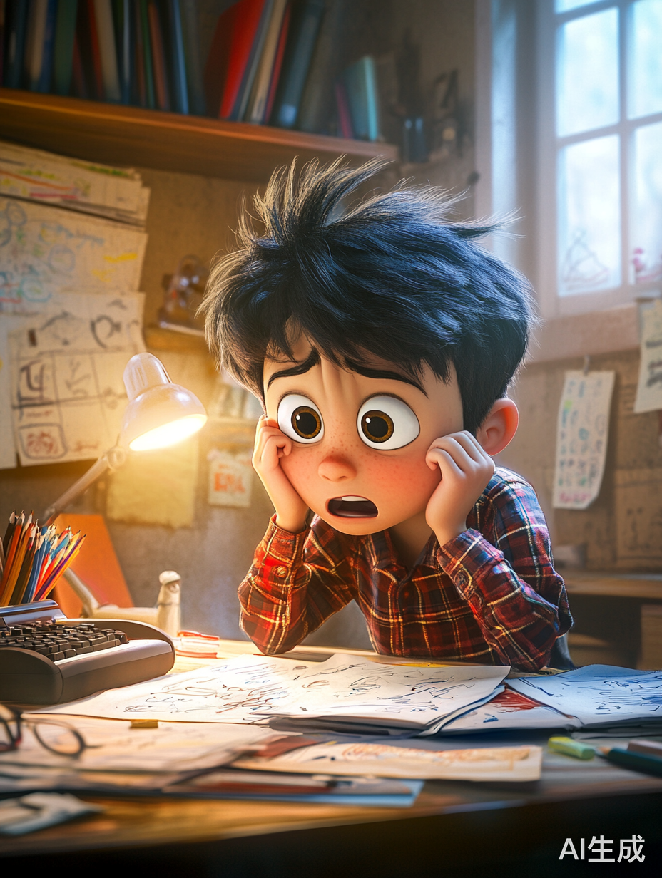 一个写作业抓耳挠腮的五岁小男孩。皮克斯风格