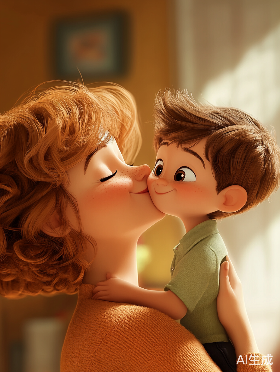 被妈妈亲吻很开心的小男孩。皮克斯风格