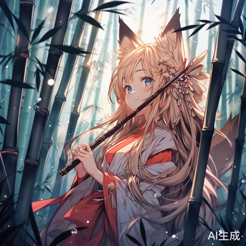 一个古风女孩,头上又狐狸耳朵。身穿浅红色仙女裙,拿着浅蓝色竹笛站在竹叶满天飞的竹林里,眼神有些落寞,又有些无奈。侧看着远方。银白色的长发及腰。眼睛是星辰眼。五官紧致。