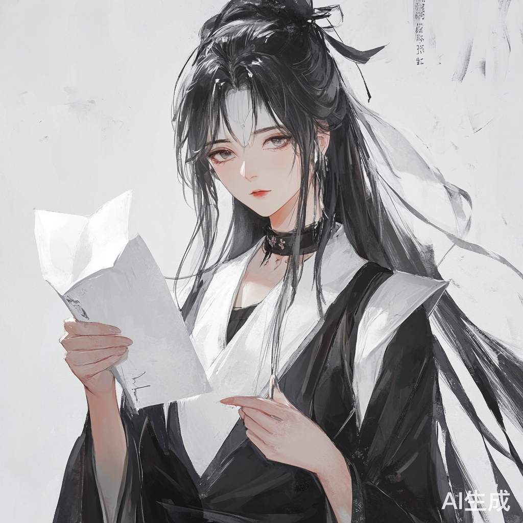 一个现代风女孩,身穿黑白色荷叶飞袖衬衫裙,表情冷漠,五官紧致,额头凌乱碎发衬托出破碎感。手里攥着几张白色的纸。整个人看起来非常高冷。,骨感,高,黑白相间的长发,空气刘海,半身,苦笑,冷白色,白色背景,半透明,抛光,气氛照明,冷光,轮廓光。冷色调水墨质感