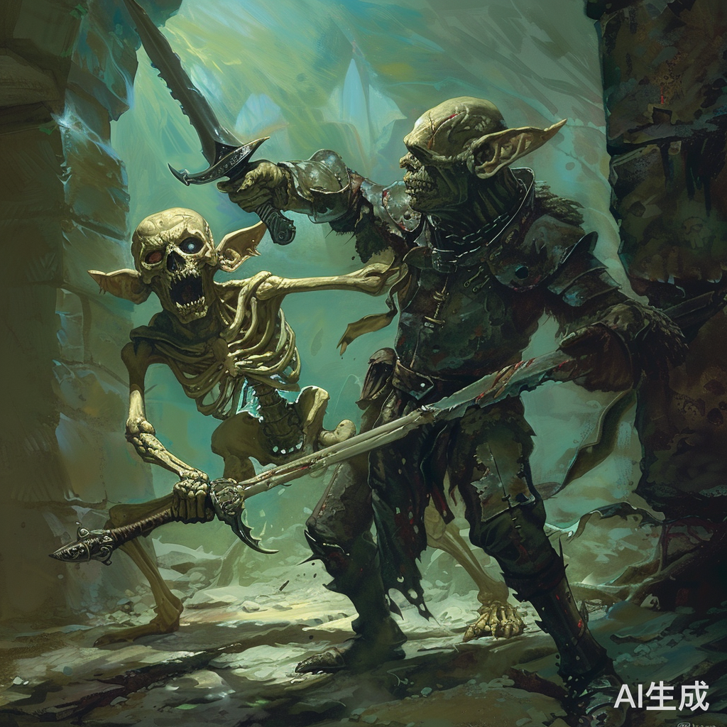 一只手拿大刀的哥布林打向一只身穿破烂盔甲手拿大刀的骷髅