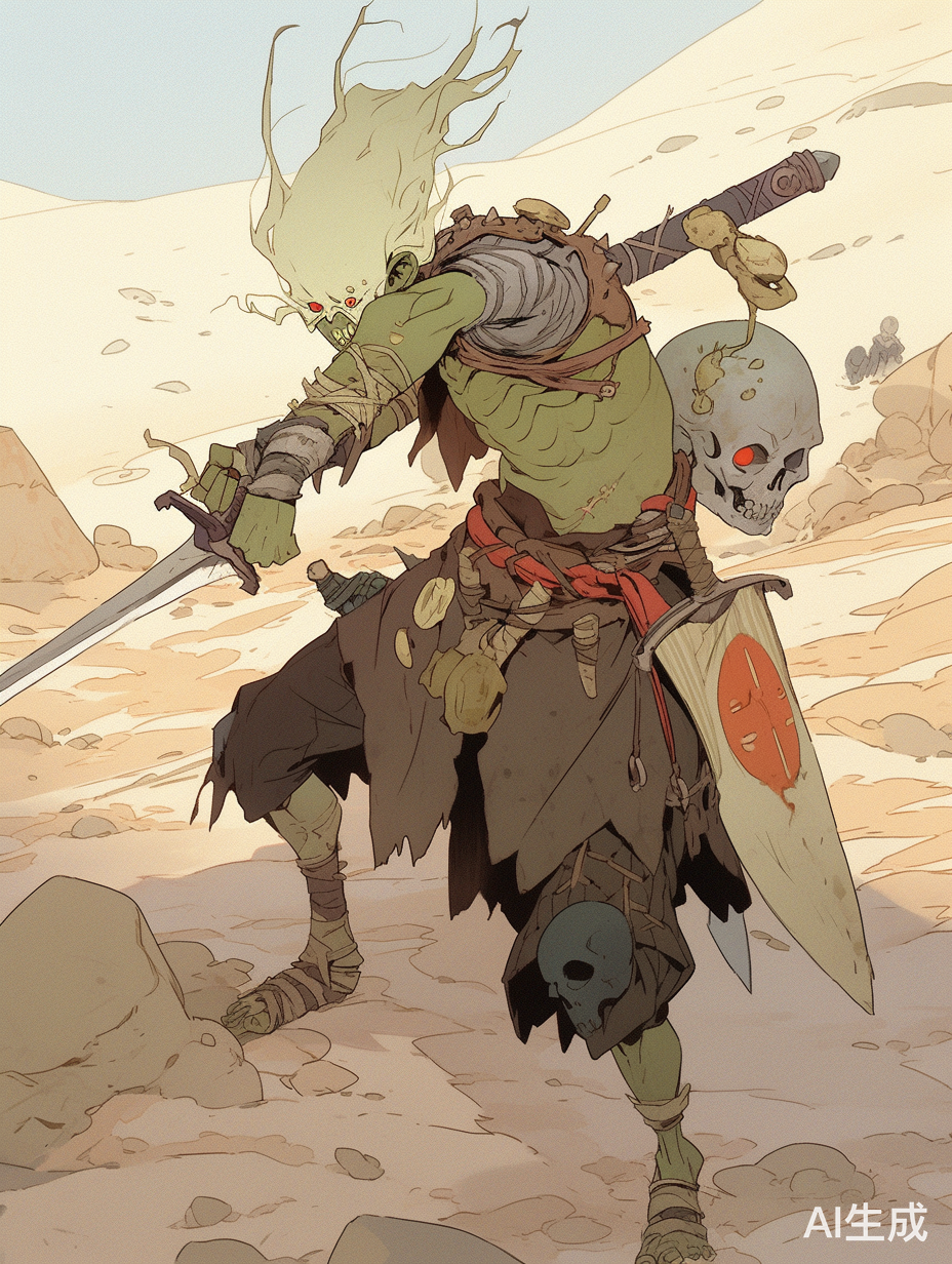 在一片荒漠里一只手拿大刀的哥布林打向一只身穿破烂盔甲手拿大刀的骷髅