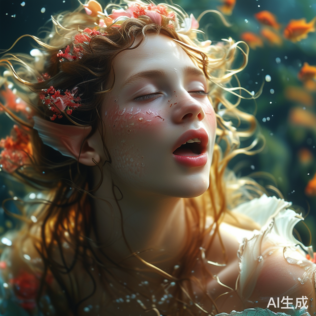 一片西瓜地上结满了圆圆的西瓜,一只白色的毛茸茸的小猫咪趴在一个西瓜上吃着一瓣红红的西瓜,画风调皮可爱