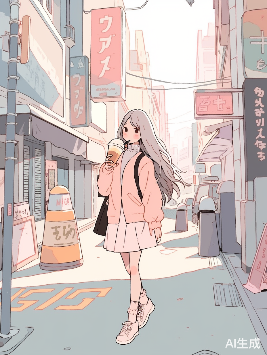 一个穿着短袖、裙子的女性角色正在繁忙的街道上行走,她似乎正在与旁边的人交谈。手里拿着奶茶,此外,还有一些建筑物和广告牌。整个场景给人一种忙碌都市的感觉。手绘风格的卡通插画,韩式漫画风格,可爱、粉嫩的色彩、精致的线条、柔和的光线、全身照,高跟鞋,远景