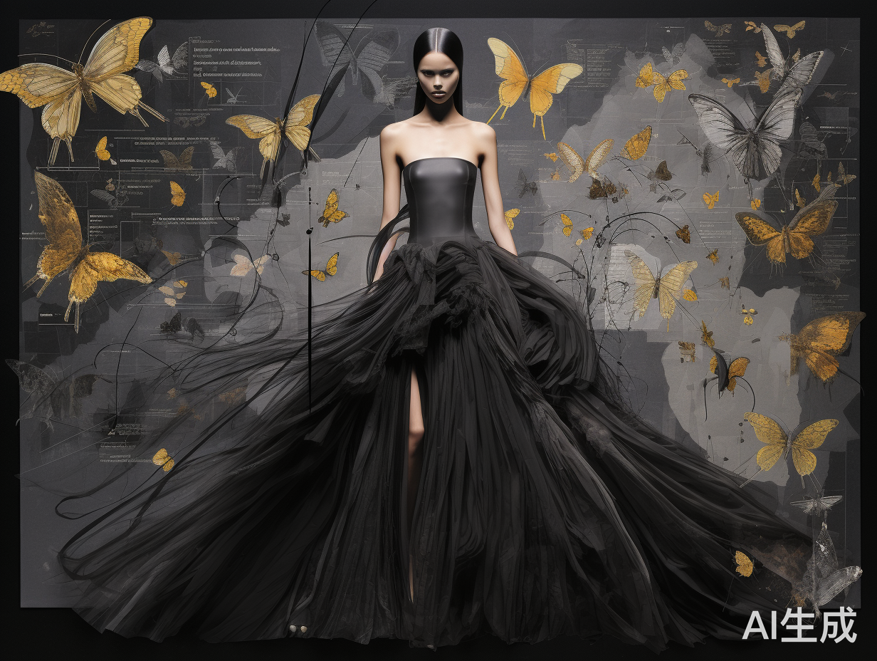 创意造型服装,将皮影的轮廓和形状应用到服装的廓形设计中,具有皮影特征的衣领、袖口、裙摆等,多层叠加结构,立体感、层次感。色彩采用皮影染色技术,体现工艺细节,史诗感的艺术性,文化感强,创意服装造型,O廓形