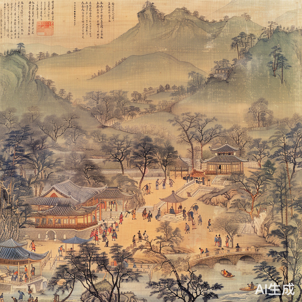 voic.51webjs.comtos-cn-i-699z2ac540user%2Fcfb10d156cc0487db500daaf5bce46b7.mf~tplv-699z2ac540-image.png A traditional Korean landscape painting depicting the Han Dynasty, showcasing people in period attire engaging in various activities within an ancient village setting. The scene includes architecture and nature elements like trees, mountains, rivers, houses, all rendered in a detailed ink wash style. It's set against a backdrop of soft pastel colors that evoke tranquility and historical charm. v 6.0 a