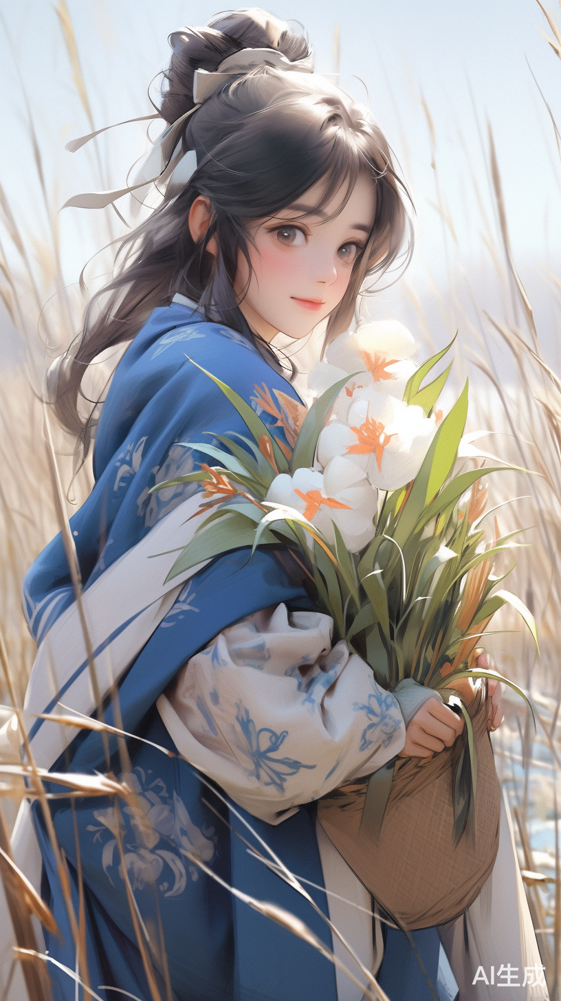 穿着蓝色三层夹棉裙袄的古代女子,兰花,草,阳光,雪