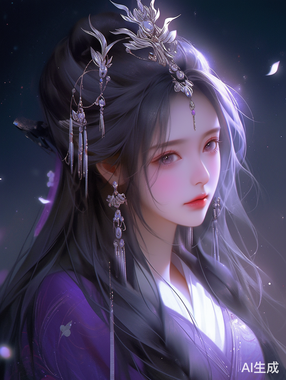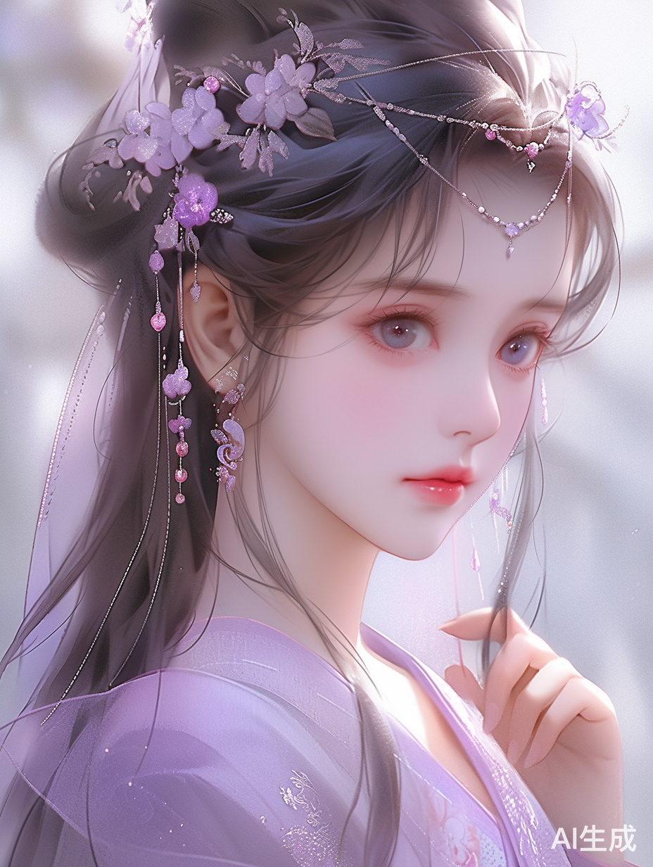 半身像,身穿深紫色华丽汉服,小巧精致绝美逼真的脸庞,最高画质,头戴精美同色系发饰,高清壁纸,中国女孩,皮肤白皙透亮,仙女出尘的气质,与世无争不食人间烟火,眼神纯净,丁达尔效应
