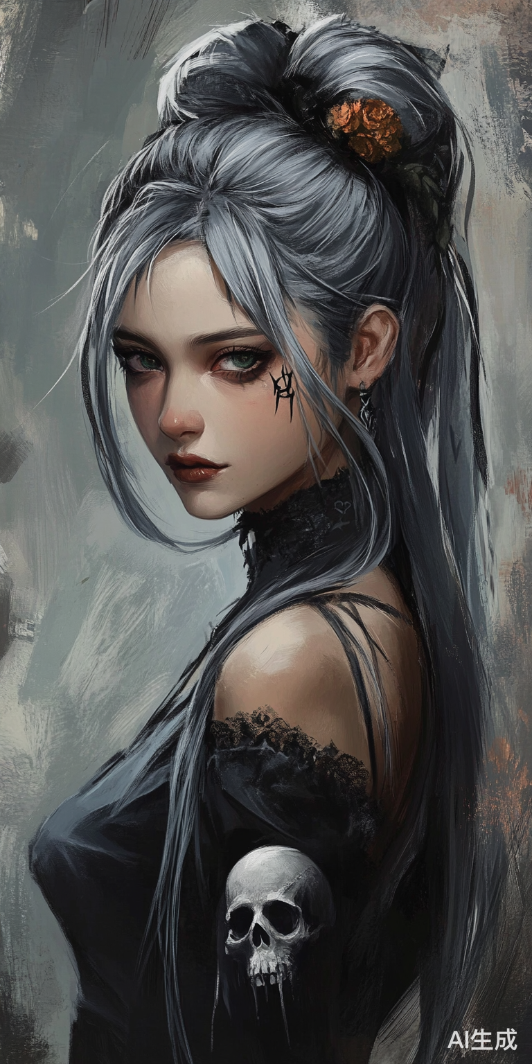 深灰色头发用骷髅头发圈绑成双马尾,操控死灵法师的哥特少女