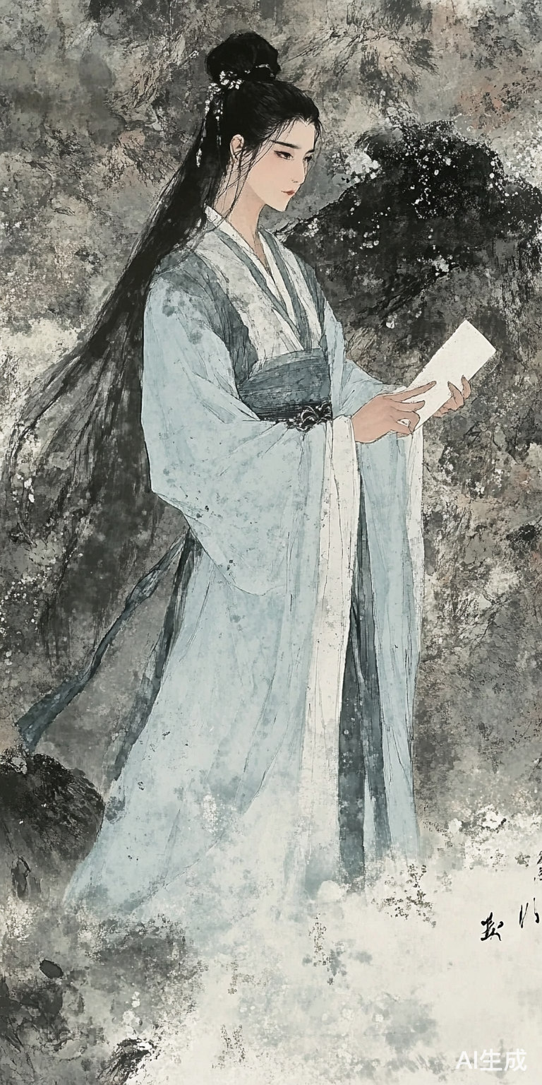 黑色齐肩发,身穿淡青色明制汉服,手拿符纸的道士御姐
