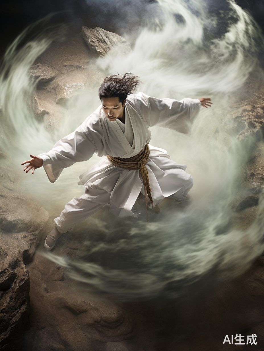 wide-angle view,cindematic angle, intense angle, photo art byHermann Hessema,A Chinese Taoist wearing white Taoist rob is praticing Chinese Tai Chi::8,body covering in starblowing::4 by the wind and rainy, flying, exquisite facial features,in the style of januz miralles, philip mackay, long exposure, in chinese traditional theme, a generation of masters, cut-out silhouettes, anime-influenced, mind-bending illusions, an ethereal picture, surrealism,freezemoment, epic detail