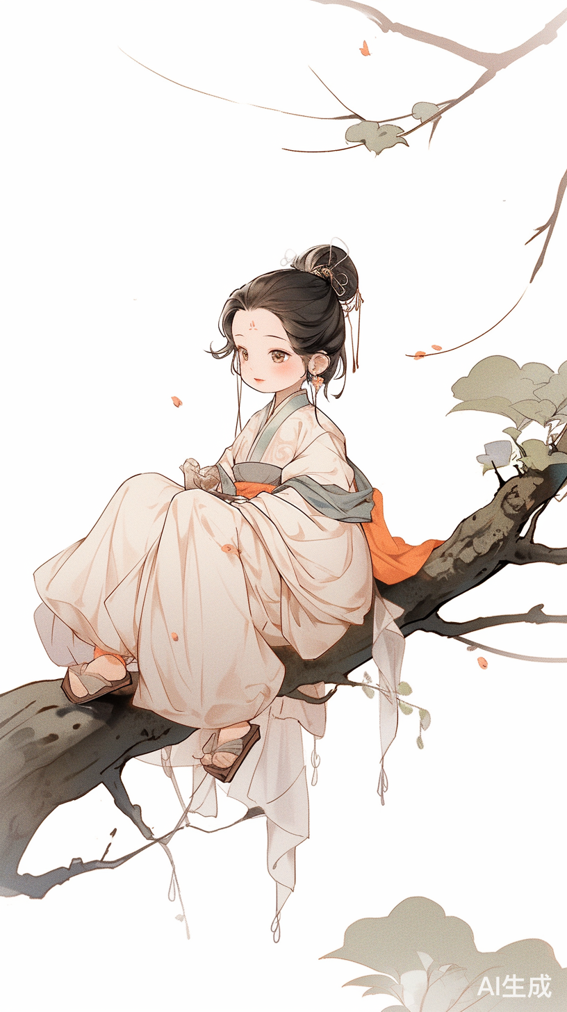 动漫男性,五官精致,帅气,中国古代风格,黑色长发、白色衣服,坐在树上