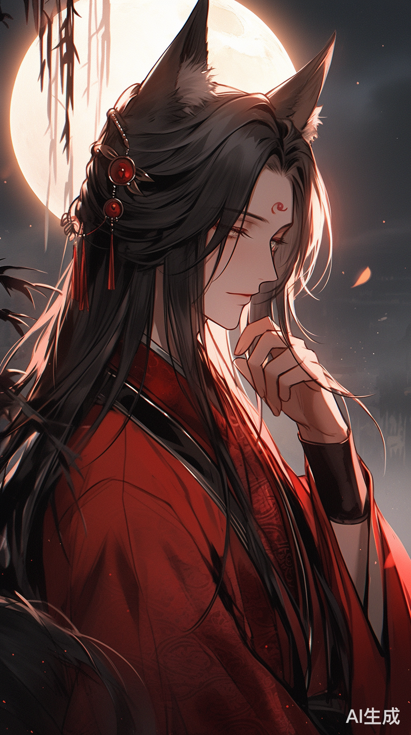 中国古代明代风格,红衣男子,面容俊朗,黑色长发,红色的狐狸耳朵,月色朦胧,自然的光亮,梦幻