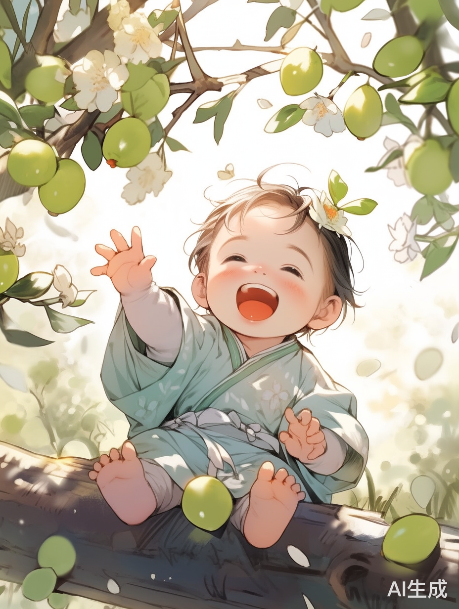 Q版,中国古代风格,可爱的小男孩,在院子里玩耍,白色的梨花背景