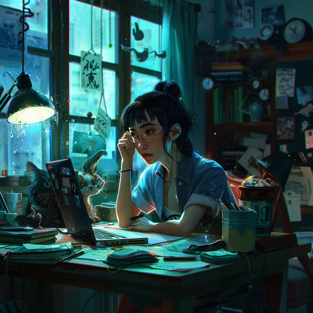 场景构图:司马迁以跪坐姿态居于画面中央,身后夯土墙面肌理斑驳,表面可见竹篾编织纹路与风化裂痕。左侧斜置梯形竹简架,分三层堆叠近百卷简册,部分简牒边缘磨损露出竹纤维。右后方立式木格窗棂间透出深青色夜空,一截虬曲枯枝横斜,弦月冷光在简册表面投下龟甲状格栅阴影。人物细节:司马迁面部呈深麦色,眉弓骨突出形成深邃眼窝,眼角鱼尾纹如刀刻般延伸至鬓角。鼻梁挺直但鼻翼两侧法令纹明显,下颌线条因缺齿稍显松弛。唇色苍白无血色,下巴光洁无任何须根残留。灰白头发以麻布巾扎成椎髻,发际线后移露出宽阔前额,耳际散落数缕银丝。服饰考据:身着右衽曲裾深衣,衣料为粗织苎麻本色,领缘及袖口镶靛青细边(宽度0.8厘米符合马王堆出土实物)。腰间束两指宽葛布带,左侧悬青玉髓印章(参考满城汉墓组佩形制)。曲裾下摆自然铺展于苇席,露出磨损严重的翘头布履,鞋底可见多次修补的葛麻补丁。器物陈设:1. 髹漆松木案几(长120cm×宽60cm×高30cm)表面细密龟裂纹中沁入墨渍,右端置错金云气纹博山炉,炉体高15cm,山形盖镂空处逸出青烟呈螺旋上升。2. 左案角青铜雁鱼灯展开双翼,灯盘盛半凝羊脂,灯烟经雁颈导入腹部清水。灯影在简面投射出水波纹,与墨字形成动态叠