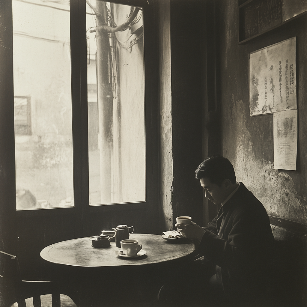 场景构图:司马迁以跪坐姿态居于画面中央,身后夯土墙面肌理斑驳,表面可见竹篾编织纹路与风化裂痕。左侧斜置梯形竹简架,分三层堆叠近百卷简册,部分简牒边缘磨损露出竹纤维。右后方立式木格窗棂间透出深青色夜空,一截虬曲枯枝横斜,弦月冷光在简册表面投下龟甲状格栅阴影。人物细节:司马迁面部呈深麦色,眉弓骨突出形成深邃眼窝,眼角鱼尾纹如刀刻般延伸至鬓角。鼻梁挺直但鼻翼两侧法令纹明显,下颌线条因缺齿稍显松弛。唇色苍白无血色,下巴光洁无任何须根残留。灰白头发以麻布巾扎成椎髻,发际线后移露出宽阔前额,耳际散落数缕银丝。服饰考据:身着右衽曲裾深衣,衣料为粗织苎麻本色,领缘及袖口镶靛青细边(宽度0.8厘米符合马王堆出土实物)。腰间束两指宽葛布带,左侧悬青玉髓印章(参考满城汉墓组佩形制)。曲裾下摆自然铺展于苇席,露出磨损严重的翘头布履,鞋底可见多次修补的葛麻补丁。器物陈设:1. 髹漆松木案几(长120cm×宽60cm×高30cm)表面细密龟裂纹中沁入墨渍,右端置错金云气纹博山炉,炉体高15cm,山形盖镂空处逸出青烟呈螺旋上升。2. 左案角青铜雁鱼灯展开双翼,灯盘盛半凝羊脂,灯烟经雁颈导入腹部清水。灯影在简面投射出水波纹,与墨字形成动态叠