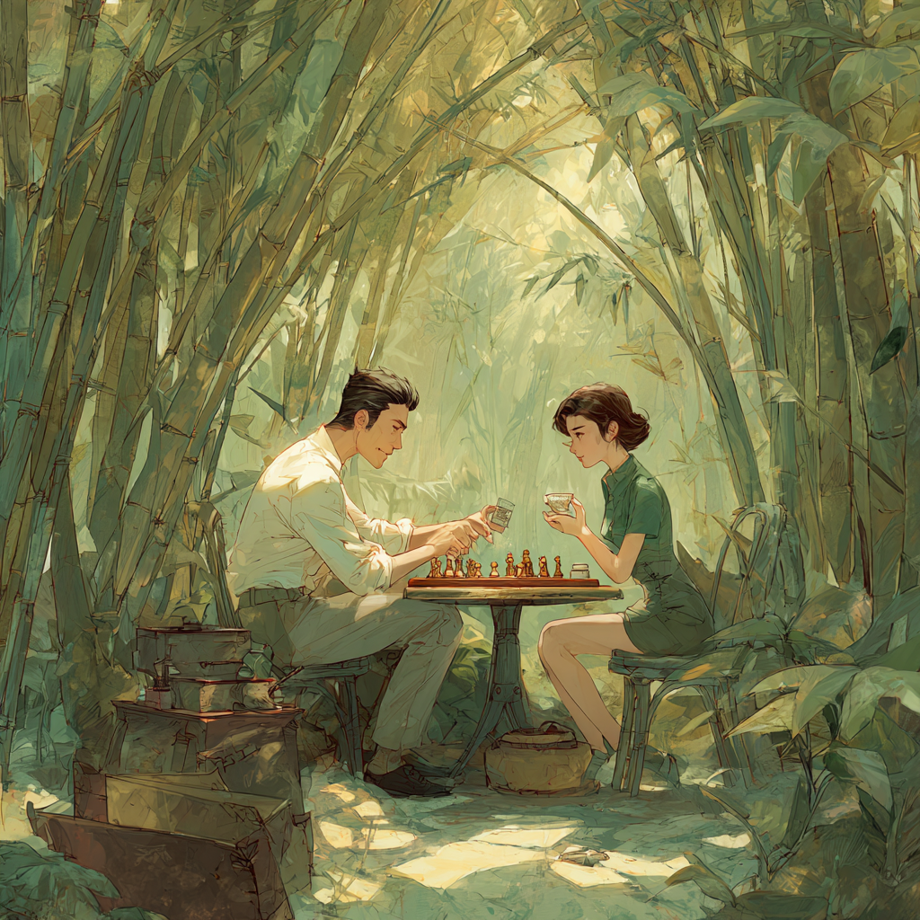 场景构图:司马迁以跪坐姿态居于画面中央,身后夯土墙面肌理斑驳,表面可见竹篾编织纹路与风化裂痕。左侧斜置梯形竹简架,分三层堆叠近百卷简册,部分简牒边缘磨损露出竹纤维。右后方立式木格窗棂间透出深青色夜空,一截虬曲枯枝横斜,弦月冷光在简册表面投下龟甲状格栅阴影。人物细节:司马迁面部呈深麦色,眉弓骨突出形成深邃眼窝,眼角鱼尾纹如刀刻般延伸至鬓角。鼻梁挺直但鼻翼两侧法令纹明显,下颌线条因缺齿稍显松弛。唇色苍白无血色,下巴光洁无任何须根残留。灰白头发以麻布巾扎成椎髻,发际线后移露出宽阔前额,耳际散落数缕银丝。服饰考据:身着右衽曲裾深衣,衣料为粗织苎麻本色,领缘及袖口镶靛青细边(宽度0.8厘米符合马王堆出土实物)。腰间束两指宽葛布带,左侧悬青玉髓印章(参考满城汉墓组佩形制)。曲裾下摆自然铺展于苇席,露出磨损严重的翘头布履,鞋底可见多次修补的葛麻补丁。器物陈设:1. 髹漆松木案几(长120cm×宽60cm×高30cm)表面细密龟裂纹中沁入墨渍,右端置错金云气纹博山炉,炉体高15cm,山形盖镂空处逸出青烟呈螺旋上升。2. 左案角青铜雁鱼灯展开双翼,灯盘盛半凝羊脂,灯烟经雁颈导入腹部清水。灯影在简面投射出水波纹,与墨字形成动态叠