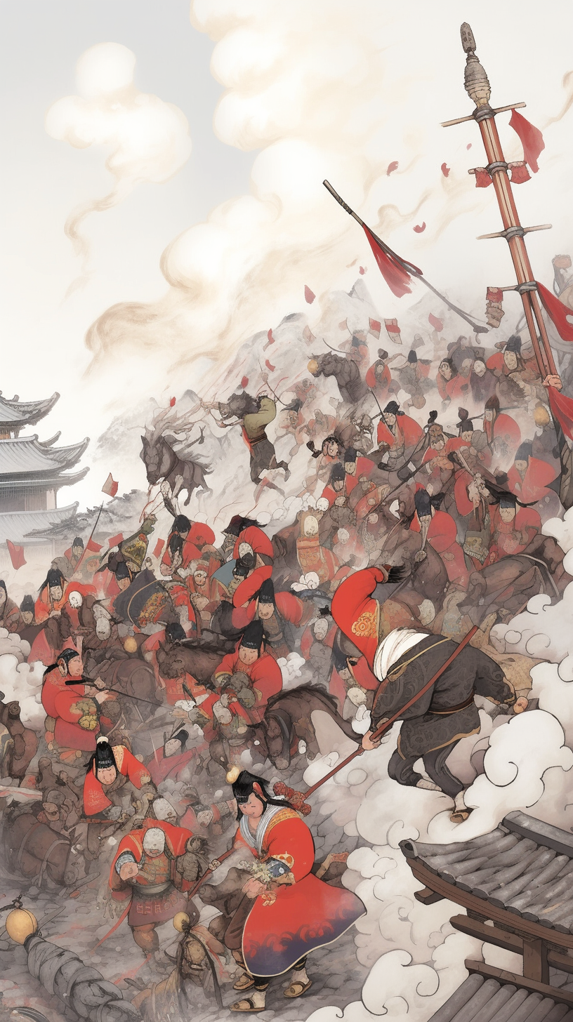 场景构图:司马迁以跪坐姿态居于画面中央,身后夯土墙面肌理斑驳,表面可见竹篾编织纹路与风化裂痕。左侧斜置梯形竹简架,分三层堆叠近百卷简册,部分简牒边缘磨损露出竹纤维。右后方立式木格窗棂间透出深青色夜空,一截虬曲枯枝横斜,弦月冷光在简册表面投下龟甲状格栅阴影。人物细节:司马迁面部呈深麦色,眉弓骨突出形成深邃眼窝,眼角鱼尾纹如刀刻般延伸至鬓角。鼻梁挺直但鼻翼两侧法令纹明显,下颌线条因缺齿稍显松弛。唇色苍白无血色,下巴光洁无任何须根残留。灰白头发以麻布巾扎成椎髻,发际线后移露出宽阔前额,耳际散落数缕银丝。服饰考据:身着右衽曲裾深衣,衣料为粗织苎麻本色,领缘及袖口镶靛青细边(宽度0.8厘米符合马王堆出土实物)。腰间束两指宽葛布带,左侧悬青玉髓印章(参考满城汉墓组佩形制)。曲裾下摆自然铺展于苇席,露出磨损严重的翘头布履,鞋底可见多次修补的葛麻补丁。器物陈设:1. 髹漆松木案几(长120cm×宽60cm×高30cm)表面细密龟裂纹中沁入墨渍,右端置错金云气纹博山炉,炉体高15cm,山形盖镂空处逸出青烟呈螺旋上升。2. 左案角青铜雁鱼灯展开双翼,灯盘盛半凝羊脂,灯烟经雁颈导入腹部清水。灯影在简面投射出水波纹,与墨字形成动态叠
