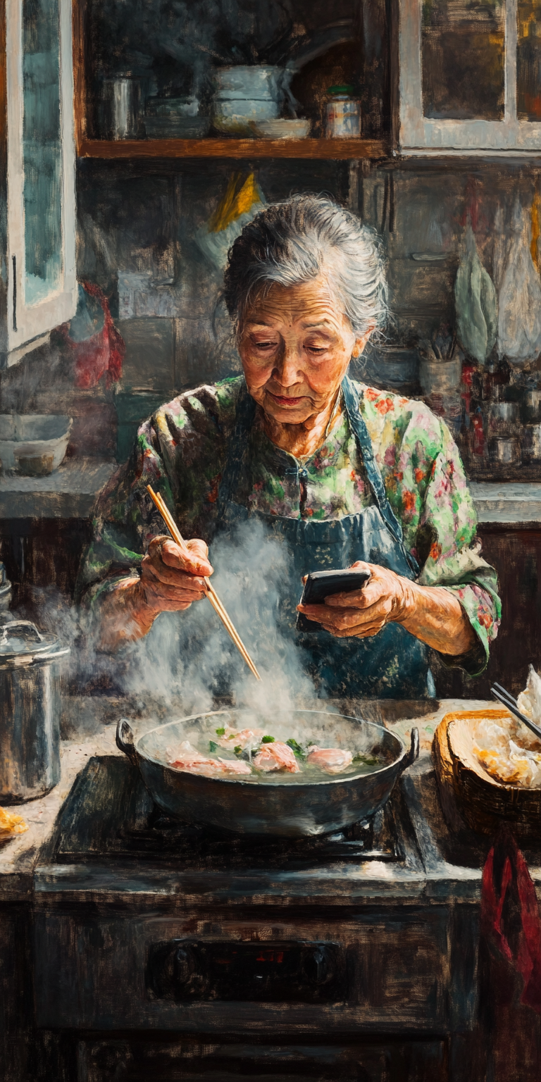 场景构图:司马迁以跪坐姿态居于画面中央,身后夯土墙面肌理斑驳,表面可见竹篾编织纹路与风化裂痕。左侧斜置梯形竹简架,分三层堆叠近百卷简册,部分简牒边缘磨损露出竹纤维。右后方立式木格窗棂间透出深青色夜空,一截虬曲枯枝横斜,弦月冷光在简册表面投下龟甲状格栅阴影。人物细节:司马迁面部呈深麦色,眉弓骨突出形成深邃眼窝,眼角鱼尾纹如刀刻般延伸至鬓角。鼻梁挺直但鼻翼两侧法令纹明显,下颌线条因缺齿稍显松弛。唇色苍白无血色,下巴光洁无任何须根残留。灰白头发以麻布巾扎成椎髻,发际线后移露出宽阔前额,耳际散落数缕银丝。服饰考据:身着右衽曲裾深衣,衣料为粗织苎麻本色,领缘及袖口镶靛青细边(宽度0.8厘米符合马王堆出土实物)。腰间束两指宽葛布带,左侧悬青玉髓印章(参考满城汉墓组佩形制)。曲裾下摆自然铺展于苇席,露出磨损严重的翘头布履,鞋底可见多次修补的葛麻补丁。器物陈设:1. 髹漆松木案几(长120cm×宽60cm×高30cm)表面细密龟裂纹中沁入墨渍,右端置错金云气纹博山炉,炉体高15cm,山形盖镂空处逸出青烟呈螺旋上升。2. 左案角青铜雁鱼灯展开双翼,灯盘盛半凝羊脂,灯烟经雁颈导入腹部清水。灯影在简面投射出水波纹,与墨字形成动态叠