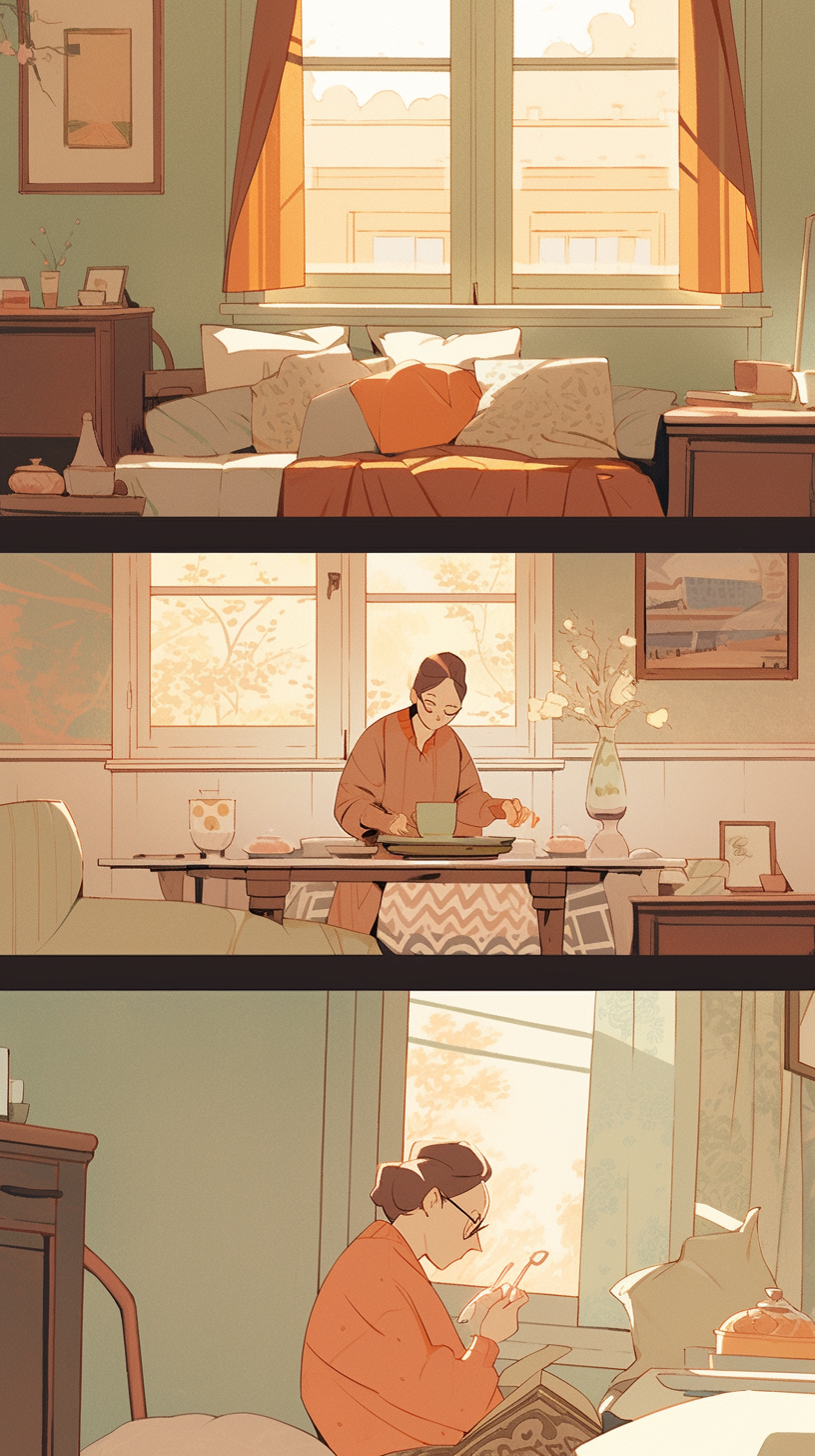 场景构图:司马迁以跪坐姿态居于画面中央,身后夯土墙面肌理斑驳,表面可见竹篾编织纹路与风化裂痕。左侧斜置梯形竹简架,分三层堆叠近百卷简册,部分简牒边缘磨损露出竹纤维。右后方立式木格窗棂间透出深青色夜空,一截虬曲枯枝横斜,弦月冷光在简册表面投下龟甲状格栅阴影。人物细节:司马迁面部呈深麦色,眉弓骨突出形成深邃眼窝,眼角鱼尾纹如刀刻般延伸至鬓角。鼻梁挺直但鼻翼两侧法令纹明显,下颌线条因缺齿稍显松弛。唇色苍白无血色,下巴光洁无任何须根残留。灰白头发以麻布巾扎成椎髻,发际线后移露出宽阔前额,耳际散落数缕银丝。服饰考据:身着右衽曲裾深衣,衣料为粗织苎麻本色,领缘及袖口镶靛青细边(宽度0.8厘米符合马王堆出土实物)。腰间束两指宽葛布带,左侧悬青玉髓印章(参考满城汉墓组佩形制)。曲裾下摆自然铺展于苇席,露出磨损严重的翘头布履,鞋底可见多次修补的葛麻补丁。器物陈设:1. 髹漆松木案几(长120cm×宽60cm×高30cm)表面细密龟裂纹中沁入墨渍,右端置错金云气纹博山炉,炉体高15cm,山形盖镂空处逸出青烟呈螺旋上升。2. 左案角青铜雁鱼灯展开双翼,灯盘盛半凝羊脂,灯烟经雁颈导入腹部清水。灯影在简面投射出水波纹,与墨字形成动态叠