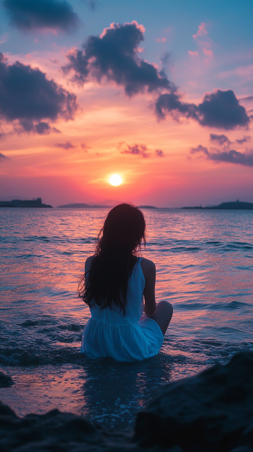 top view of A blurry woman reading a book, set against a pink and blue gradient background, There are stars,in the style of Rinko Kawauchi.