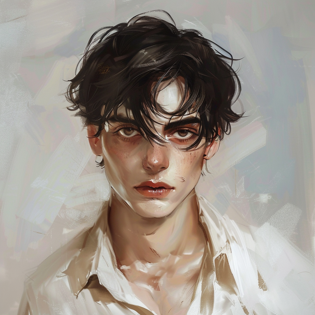场景构图:司马迁以跪坐姿态居于画面中央,身后夯土墙面肌理斑驳,表面可见竹篾编织纹路与风化裂痕。左侧斜置梯形竹简架,分三层堆叠近百卷简册,部分简牒边缘磨损露出竹纤维。右后方立式木格窗棂间透出深青色夜空,一截虬曲枯枝横斜,弦月冷光在简册表面投下龟甲状格栅阴影。人物细节:司马迁面部呈深麦色,眉弓骨突出形成深邃眼窝,眼角鱼尾纹如刀刻般延伸至鬓角。鼻梁挺直但鼻翼两侧法令纹明显,下颌线条因缺齿稍显松弛。唇色苍白无血色,下巴光洁无任何须根残留。灰白头发以麻布巾扎成椎髻,发际线后移露出宽阔前额,耳际散落数缕银丝。服饰考据:身着右衽曲裾深衣,衣料为粗织苎麻本色,领缘及袖口镶靛青细边(宽度0.8厘米符合马王堆出土实物)。腰间束两指宽葛布带,左侧悬青玉髓印章(参考满城汉墓组佩形制)。曲裾下摆自然铺展于苇席,露出磨损严重的翘头布履,鞋底可见多次修补的葛麻补丁。器物陈设:1. 髹漆松木案几(长120cm×宽60cm×高30cm)表面细密龟裂纹中沁入墨渍,右端置错金云气纹博山炉,炉体高15cm,山形盖镂空处逸出青烟呈螺旋上升。2. 左案角青铜雁鱼灯展开双翼,灯盘盛半凝羊脂,灯烟经雁颈导入腹部清水。灯影在简面投射出水波纹,与墨字形成动态叠