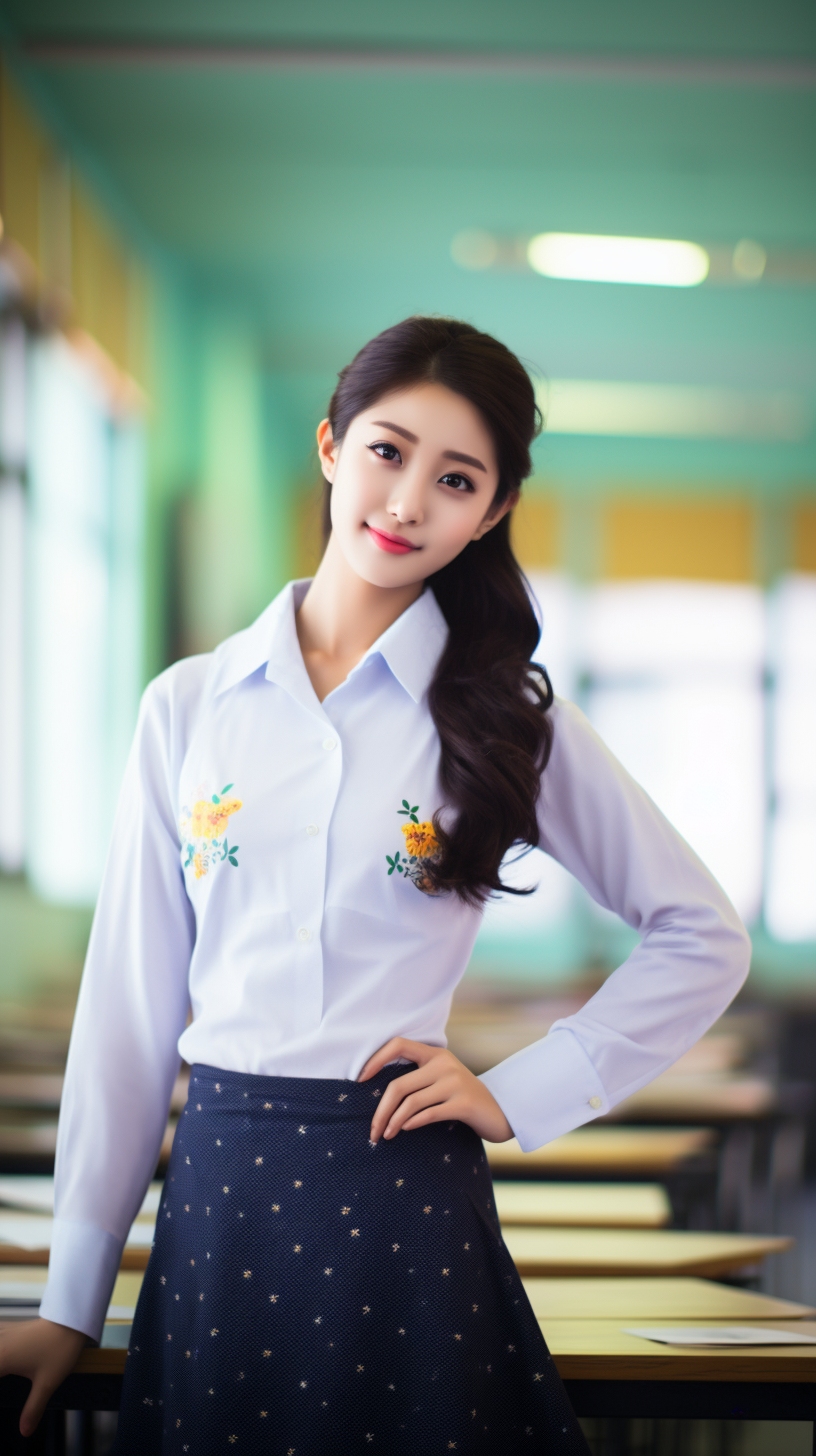 精致妆容,穿着中国高中天空蓝白色运动校服,坐在教室里,面容娇俏可爱