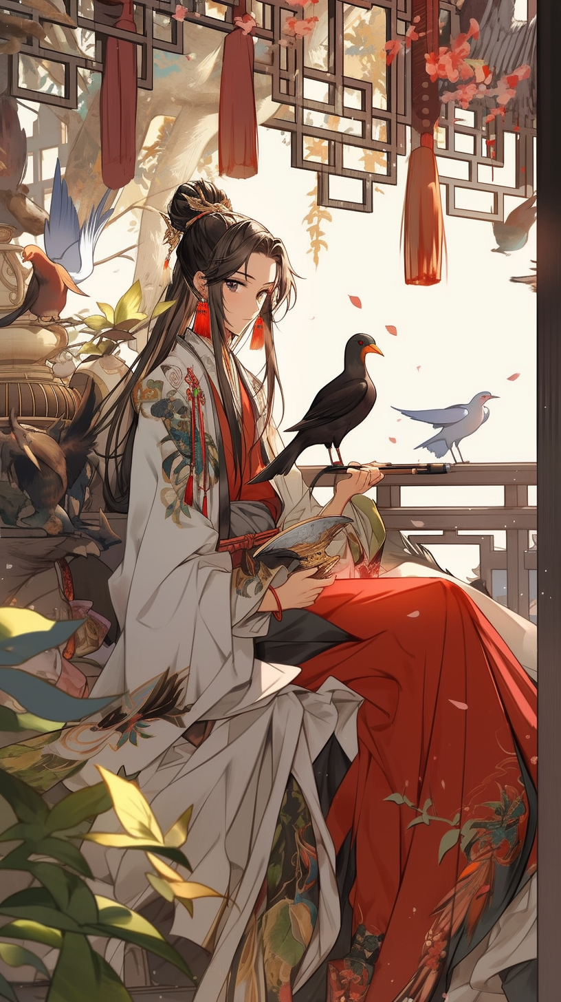 场景构图:司马迁以跪坐姿态居于画面中央,身后夯土墙面肌理斑驳,表面可见竹篾编织纹路与风化裂痕。左侧斜置梯形竹简架,分三层堆叠近百卷简册,部分简牒边缘磨损露出竹纤维。右后方立式木格窗棂间透出深青色夜空,一截虬曲枯枝横斜,弦月冷光在简册表面投下龟甲状格栅阴影。人物细节:司马迁面部呈深麦色,眉弓骨突出形成深邃眼窝,眼角鱼尾纹如刀刻般延伸至鬓角。鼻梁挺直但鼻翼两侧法令纹明显,下颌线条因缺齿稍显松弛。唇色苍白无血色,下巴光洁无任何须根残留。灰白头发以麻布巾扎成椎髻,发际线后移露出宽阔前额,耳际散落数缕银丝。服饰考据:身着右衽曲裾深衣,衣料为粗织苎麻本色,领缘及袖口镶靛青细边(宽度0.8厘米符合马王堆出土实物)。腰间束两指宽葛布带,左侧悬青玉髓印章(参考满城汉墓组佩形制)。曲裾下摆自然铺展于苇席,露出磨损严重的翘头布履,鞋底可见多次修补的葛麻补丁。器物陈设:1. 髹漆松木案几(长120cm×宽60cm×高30cm)表面细密龟裂纹中沁入墨渍,右端置错金云气纹博山炉,炉体高15cm,山形盖镂空处逸出青烟呈螺旋上升。2. 左案角青铜雁鱼灯展开双翼,灯盘盛半凝羊脂,灯烟经雁颈导入腹部清水。灯影在简面投射出水波纹,与墨字形成动态叠